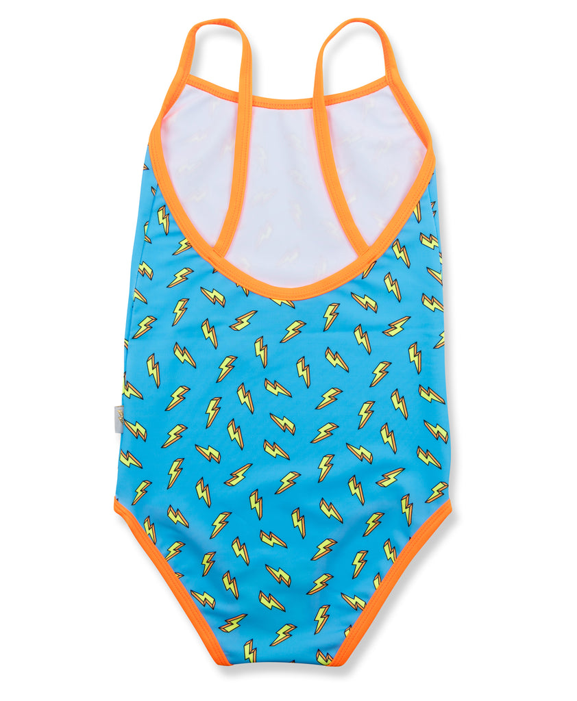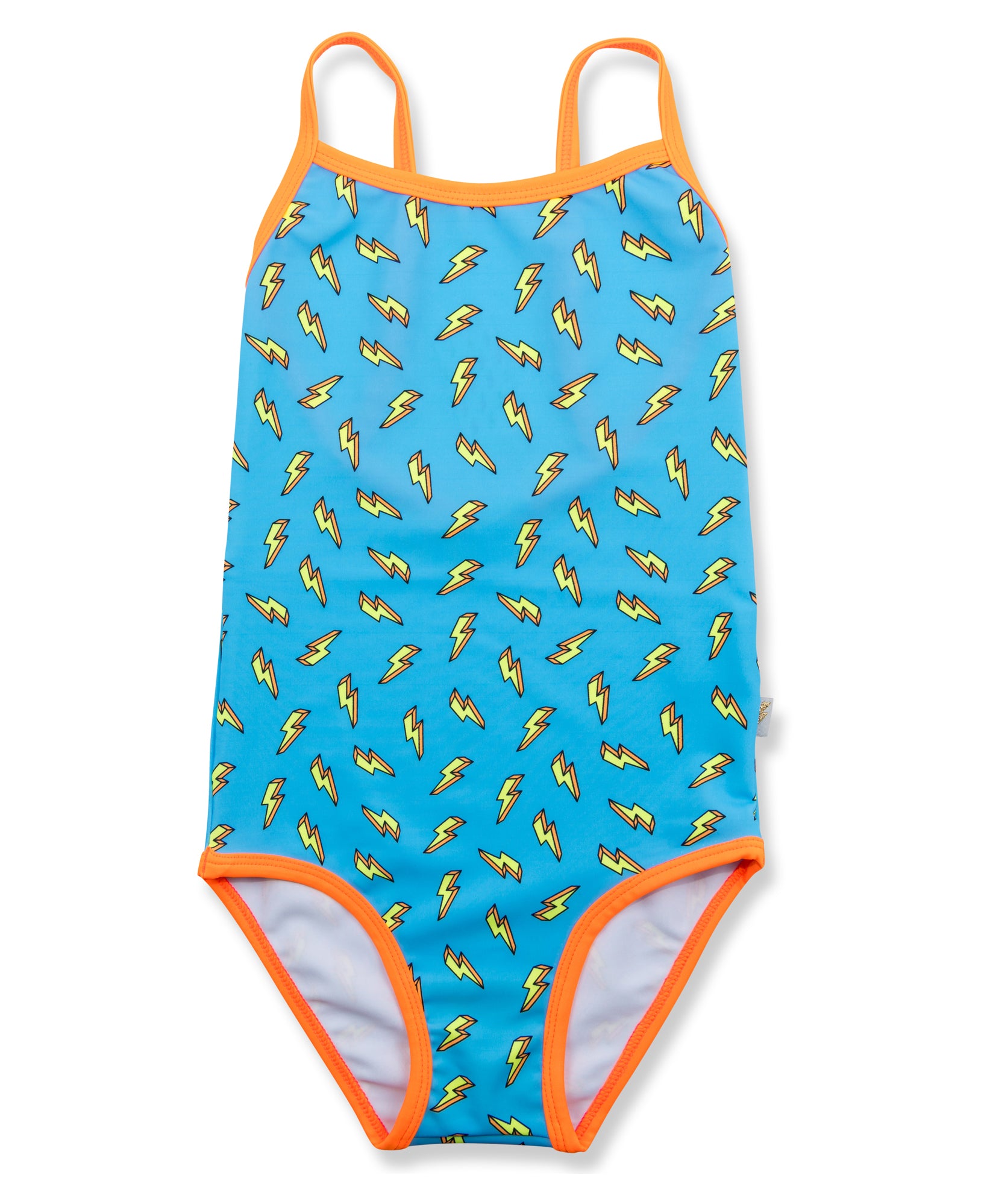 A striking twist on a classic swimsuit. Made in our bold aqua with lightning print and finished with a zingy neon orange trim to help them 'Be Seen' beachside. Luxurious, long-lasting materials and UPF 50+ UV-protection keep their holiday adventures safe.
