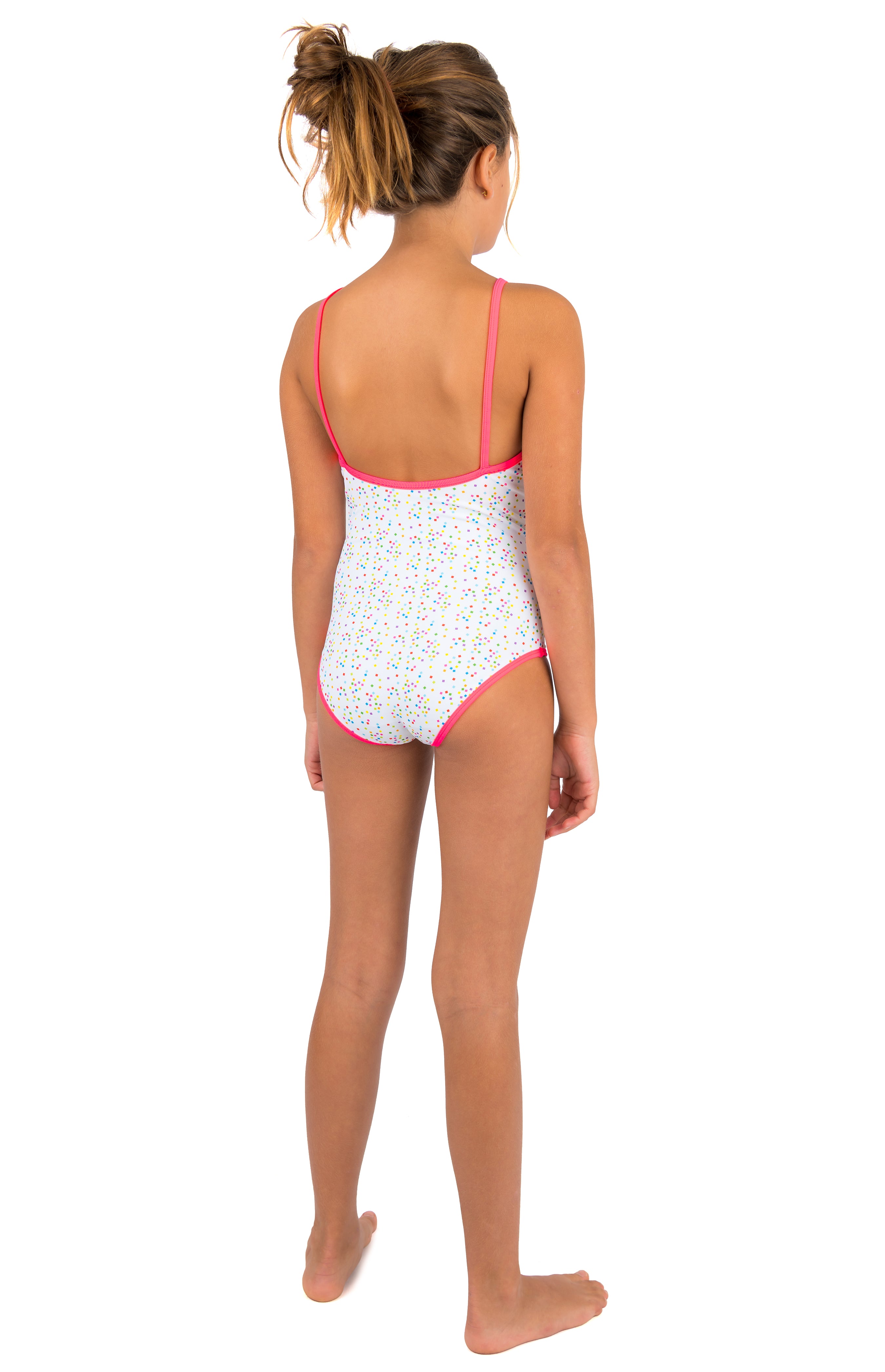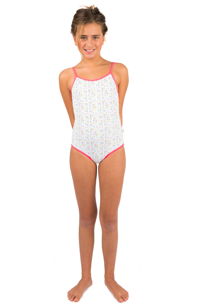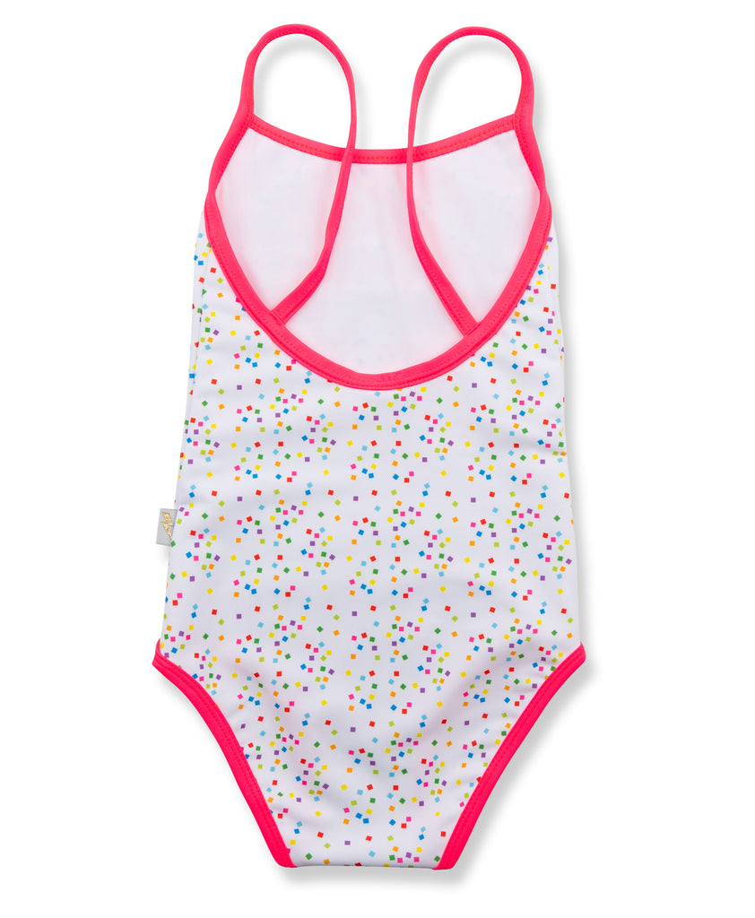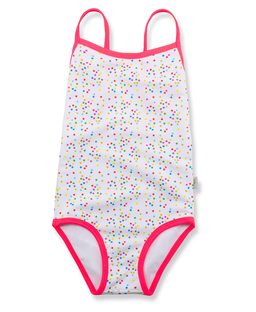 A playful twist on a crisp white swimsuit. Our Paloma cut swimming costume features an explosion of colourful pixels and striking pink straps. Bold kids' luxury, designed to protect with UPF 50+ fabrics and 'Be Seen' neon trim.