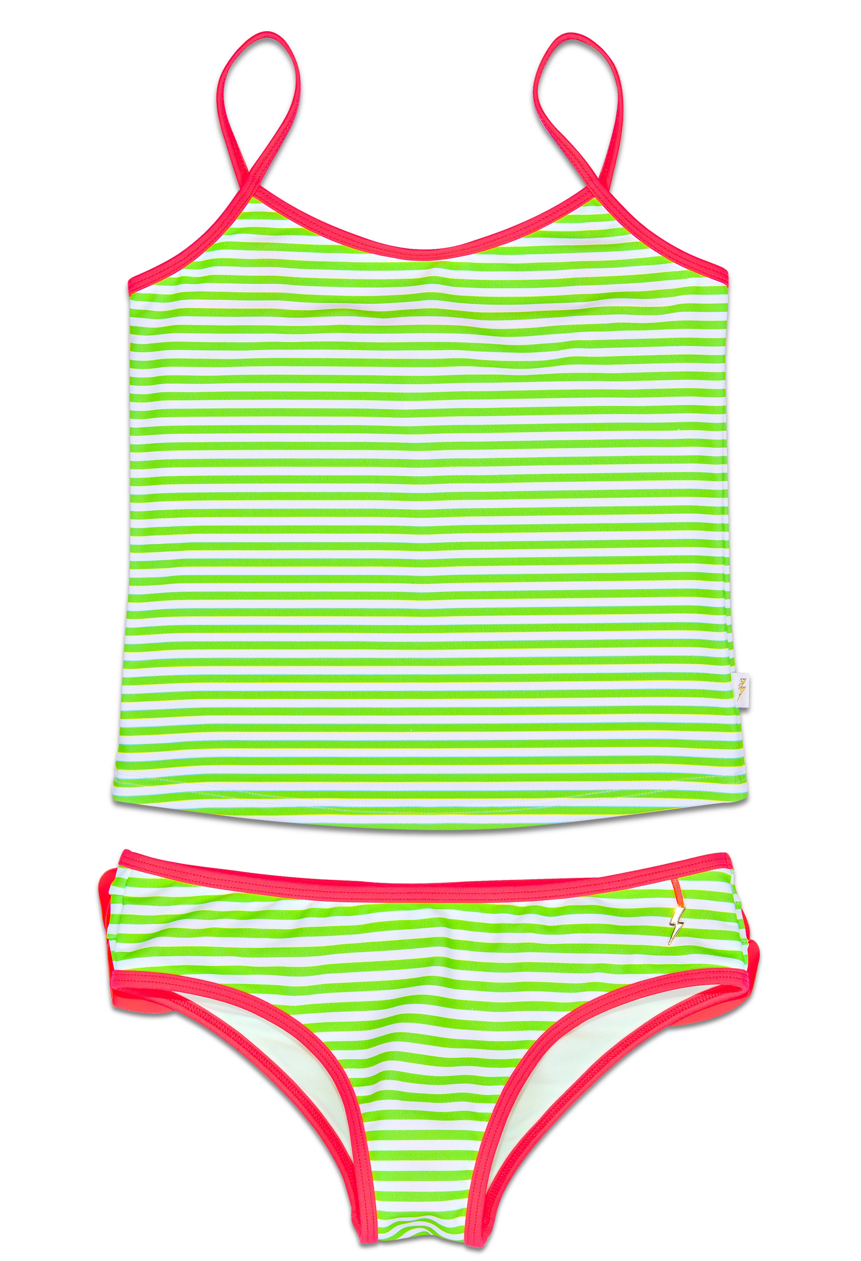 Swimwear goes bold and luxurious with this vibrant green tankini set with contrast straps.