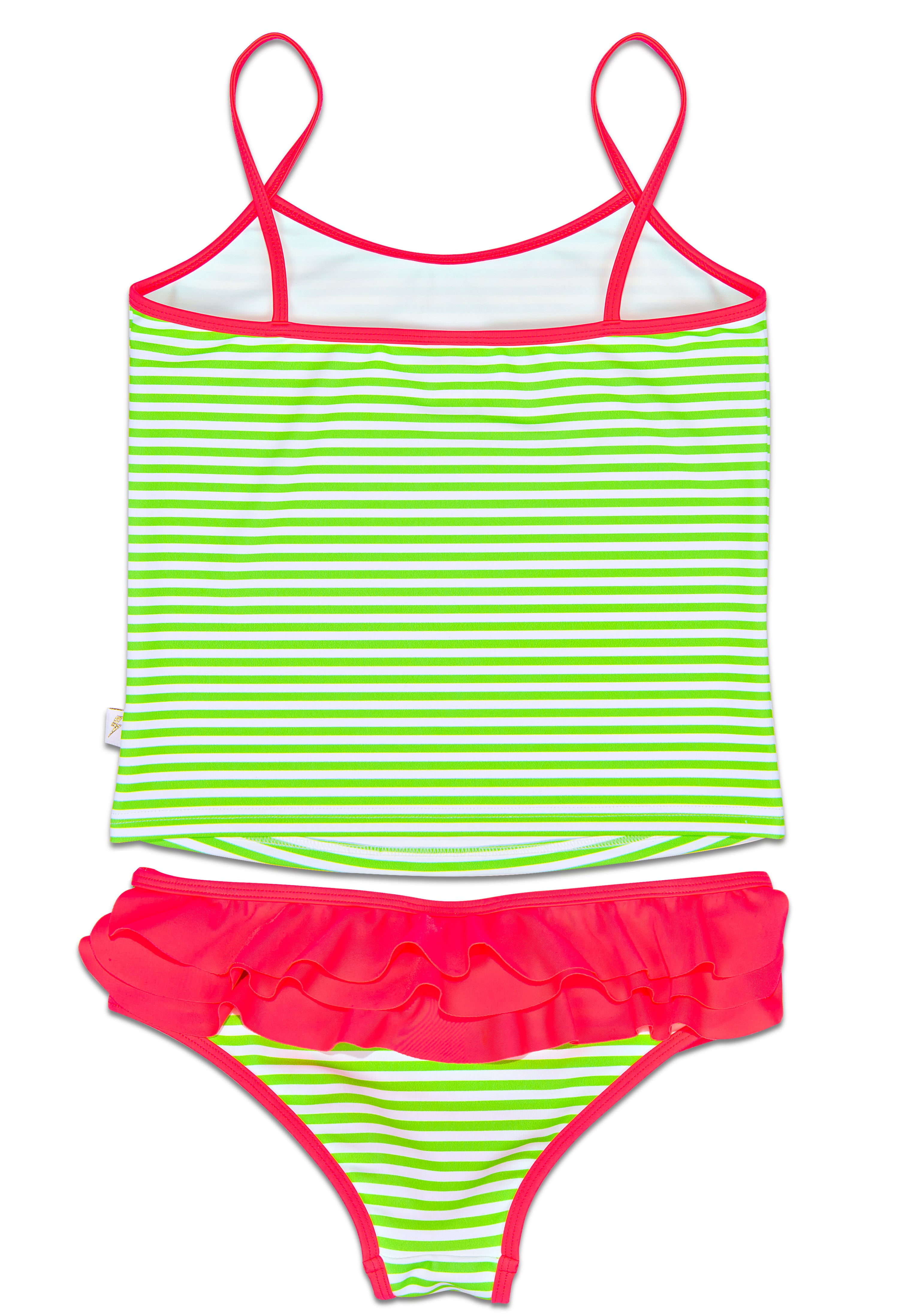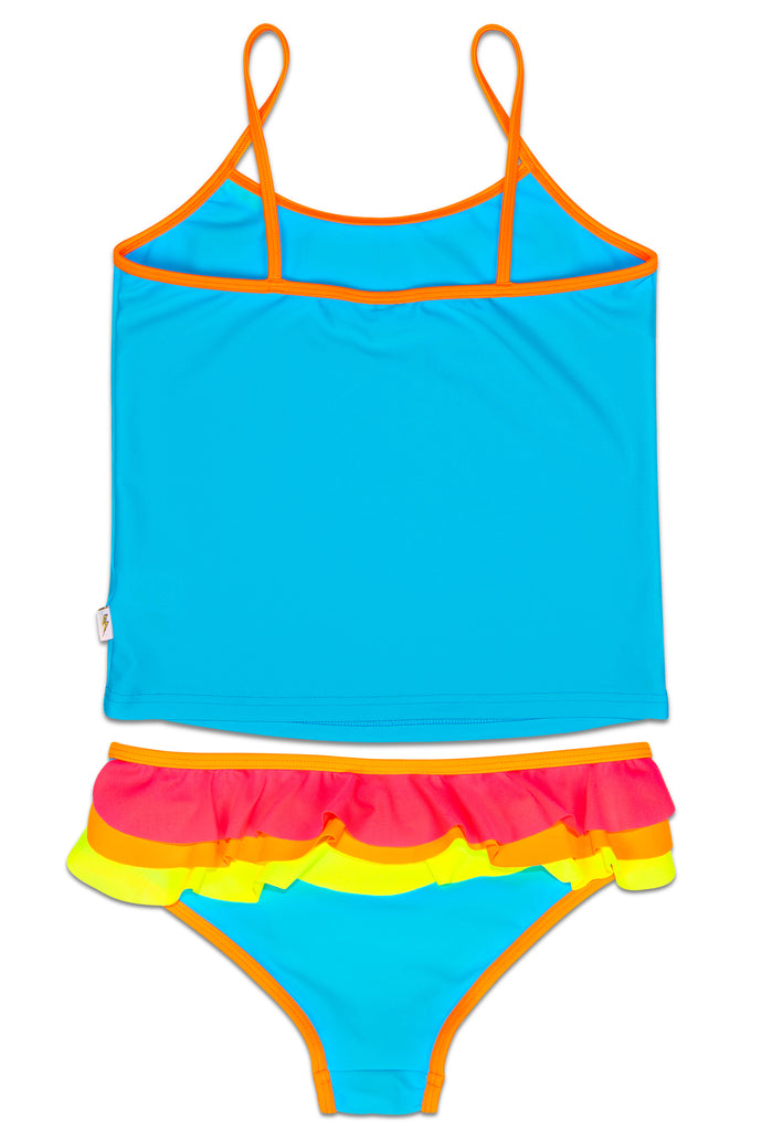 This bold tankini set features a full coverage top and frill-detail bottom with contrast neon ruffle.