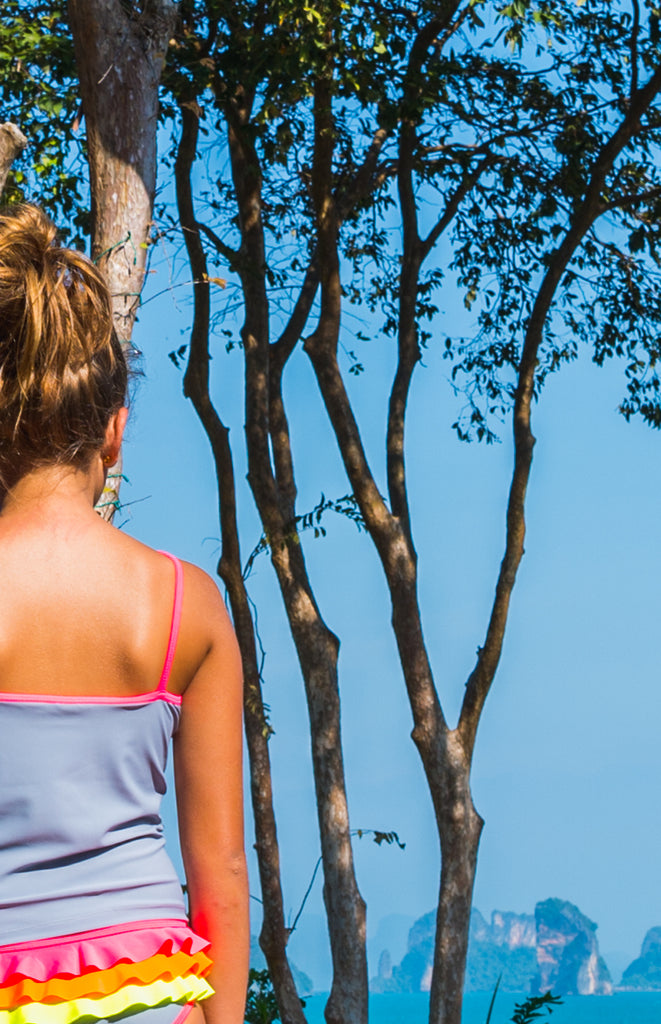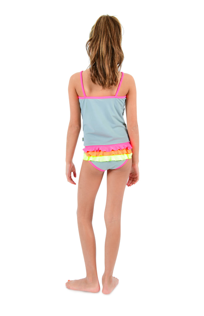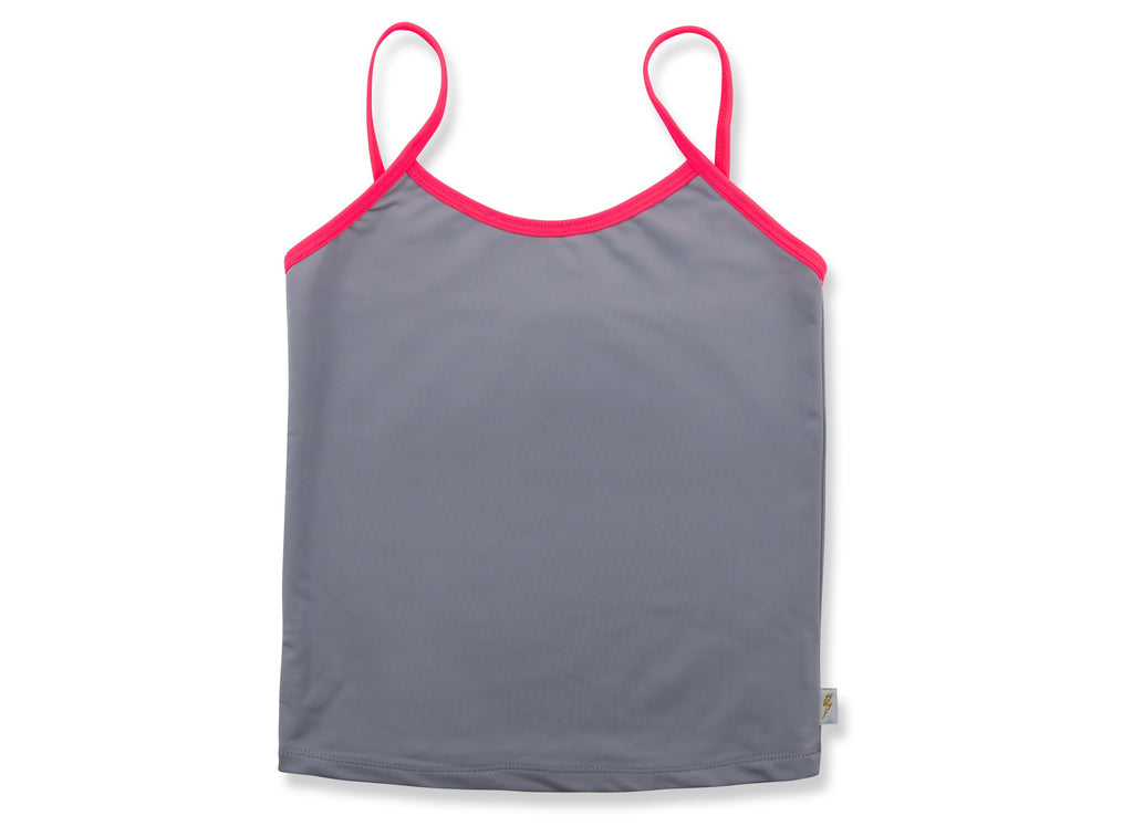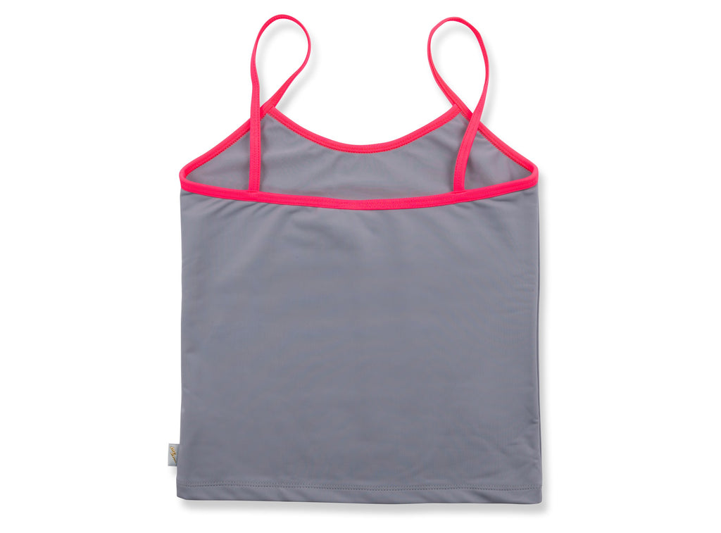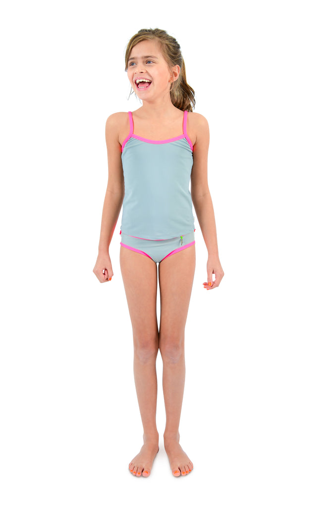 Safe, comfortable, confident and stylish – our iconic Beanie & Bear Zoe swim top in modern grey will help them feel brilliant and bold. Cut with a scooped front and made from luxurious Italian Lycra, this tankini is finished with our signature neon ‘Be Seen’ straps and offers UPF 50+ protection.