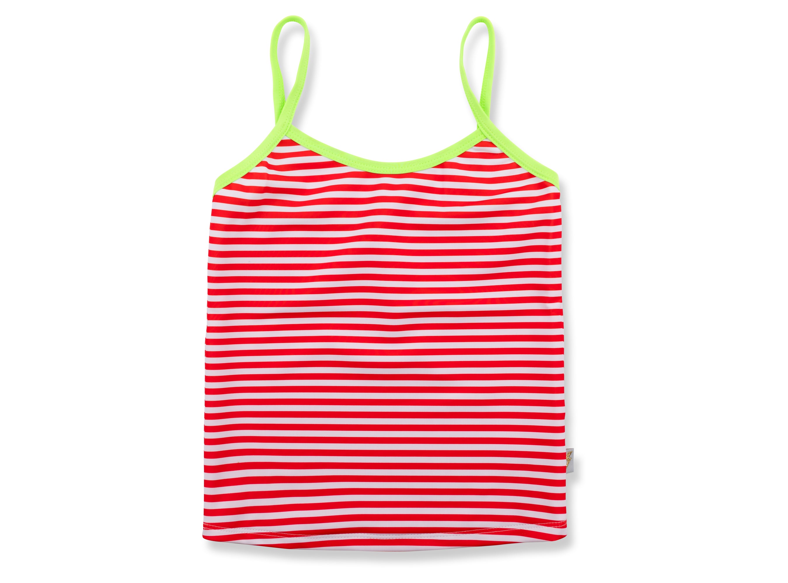 A bold take on a classic tankini. Nautically inspired red and white stripe, luxuriously finished. Protecting them with 'Be Seen' neon trim and UPF 50+ UV-protection. Quick drying and comfortable in or out of the waves.