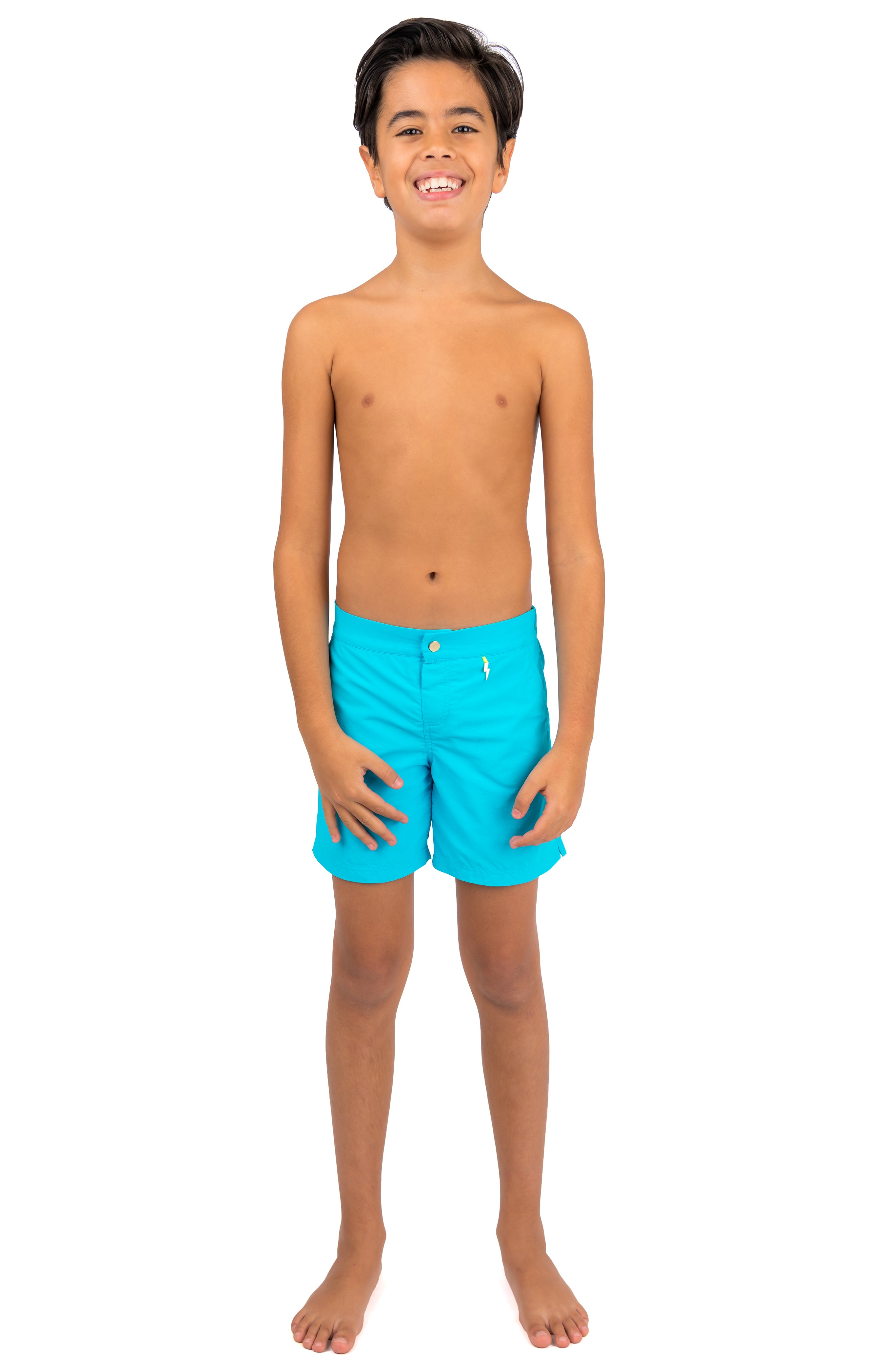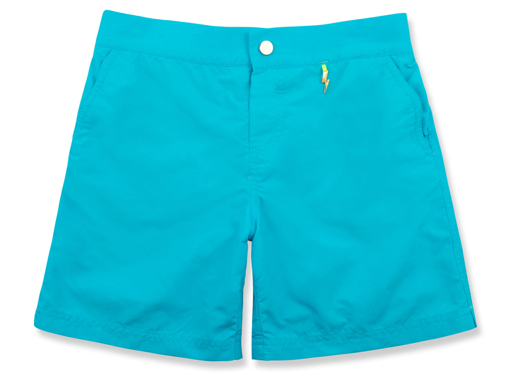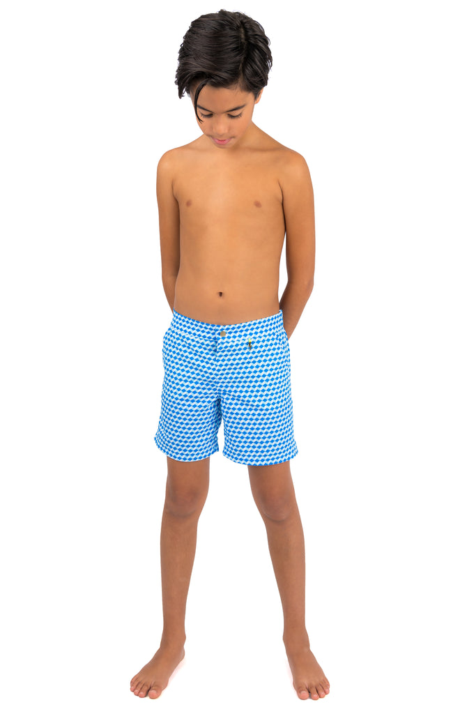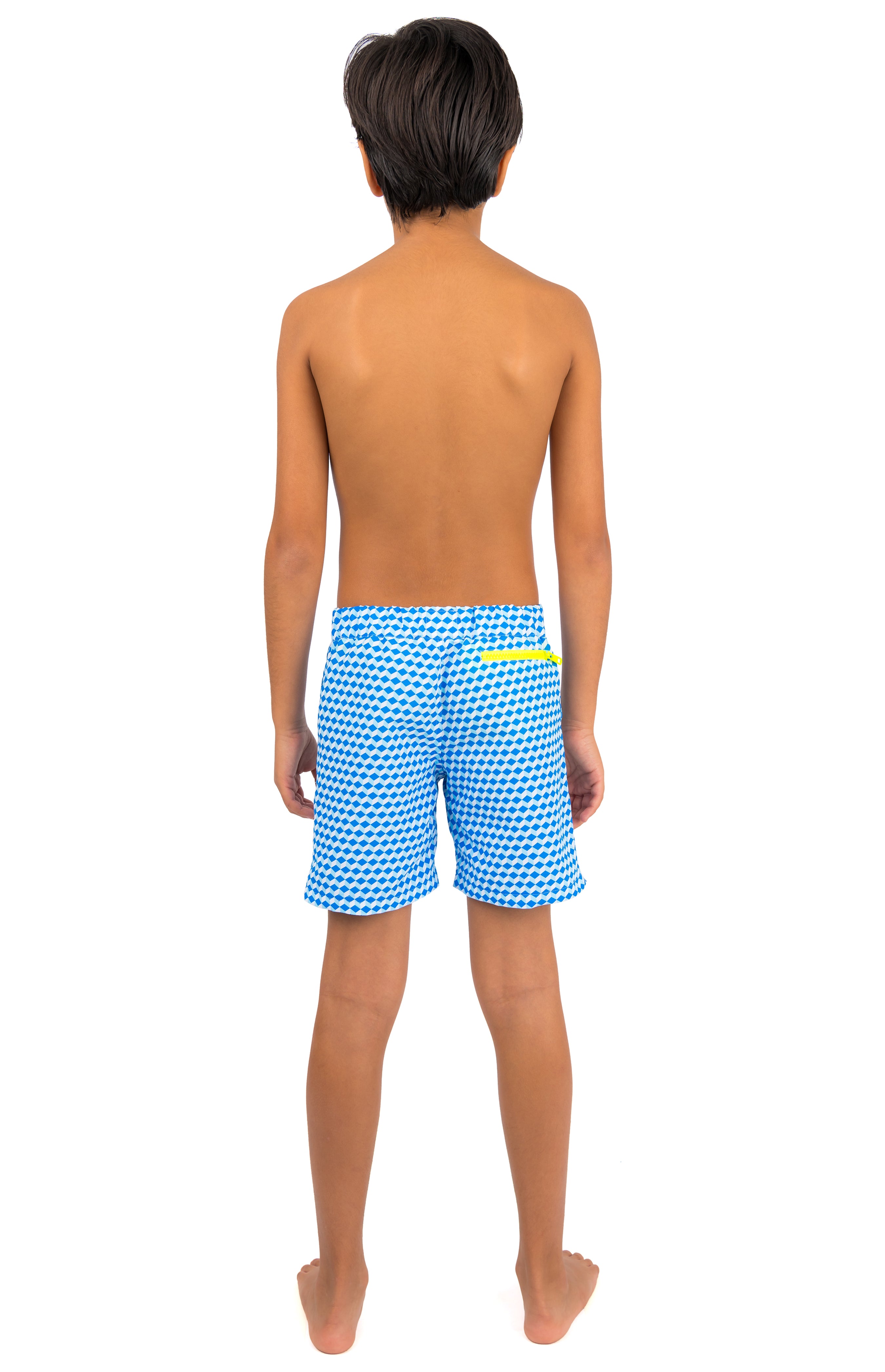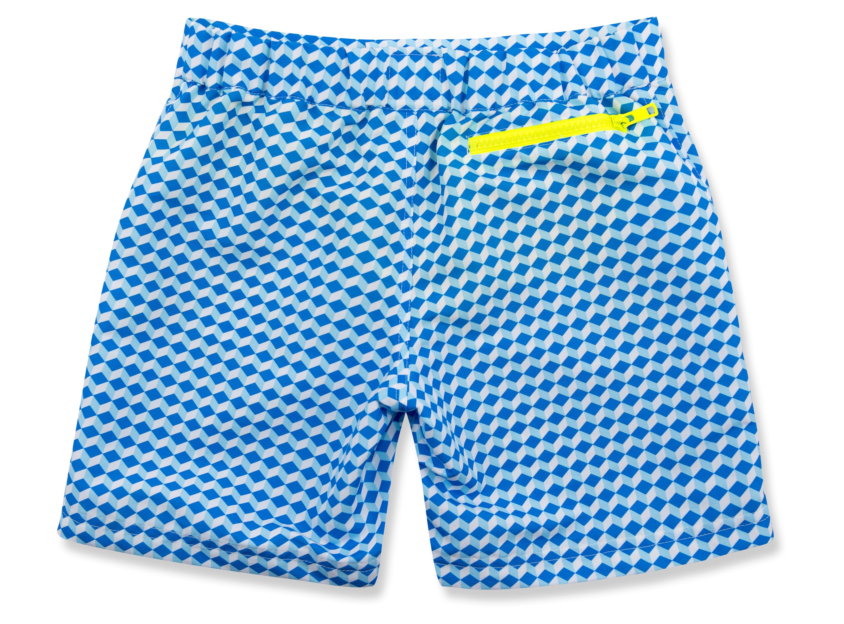 Give their beach adventures a touch of luxury with our classic Finley tailored beach shorts in Blue Cubes. Bold, brilliant and made to withstand holiday fun for generations to come. Designed to keep them safe too, with UPF50+ UV-protection and a contrast 'Be Seen' zip pocket trim in neon yellow.