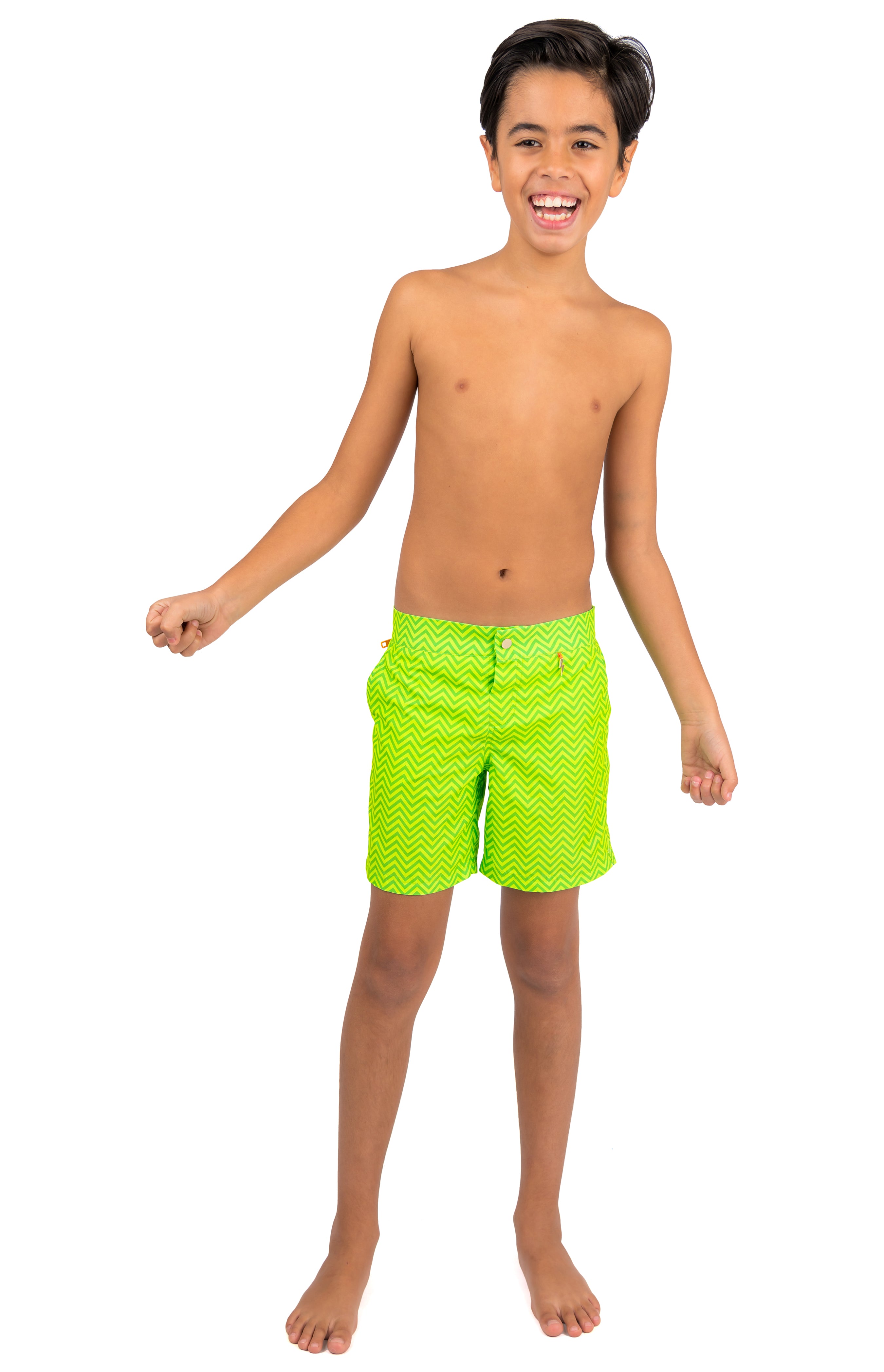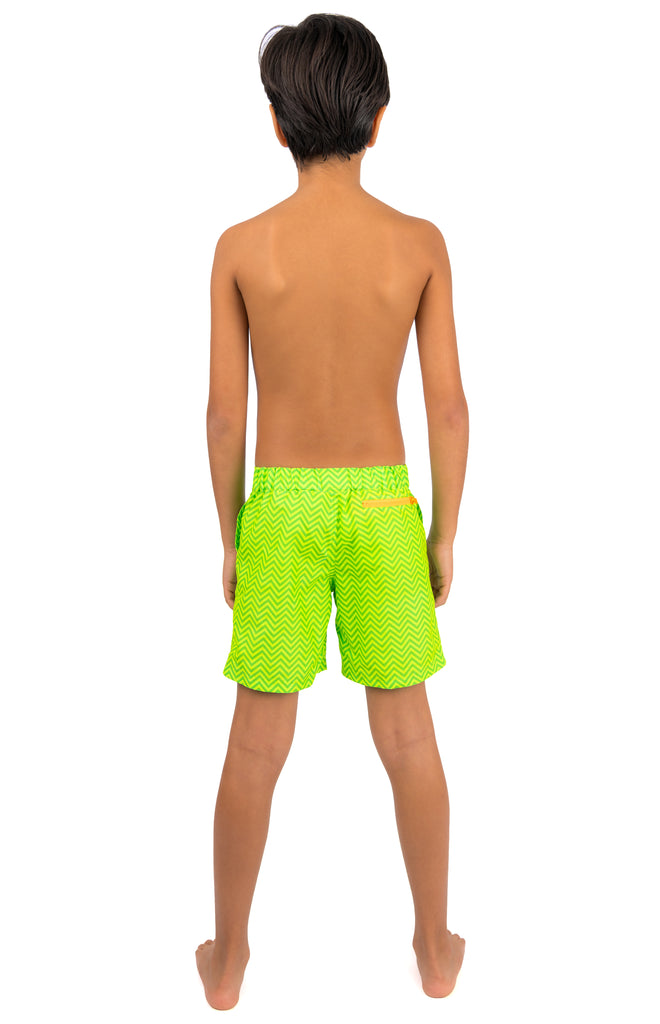 Kids beachwear goes bold and brilliant with our Finley tailored beach shorts in head turning Green Chevron print. Designed to protect, our long-lasting, ocean-ready materials offer UPF50+ UV-protection. Finished with a contrast 'Be Seen' zip pocket trim in neon orange.